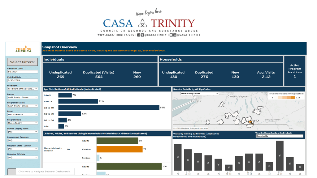 To meet needs around nutrition and food access, CASA-Trinity has piloted a project that integrates a food pantry into its treatment space in Elmira, NY, named Dutch’s Pantry. This treatment-embedded food pantry opened in August 2024 and has been such a success that another treatment-embedded food pantry location in Hornell was opened in April 2025.